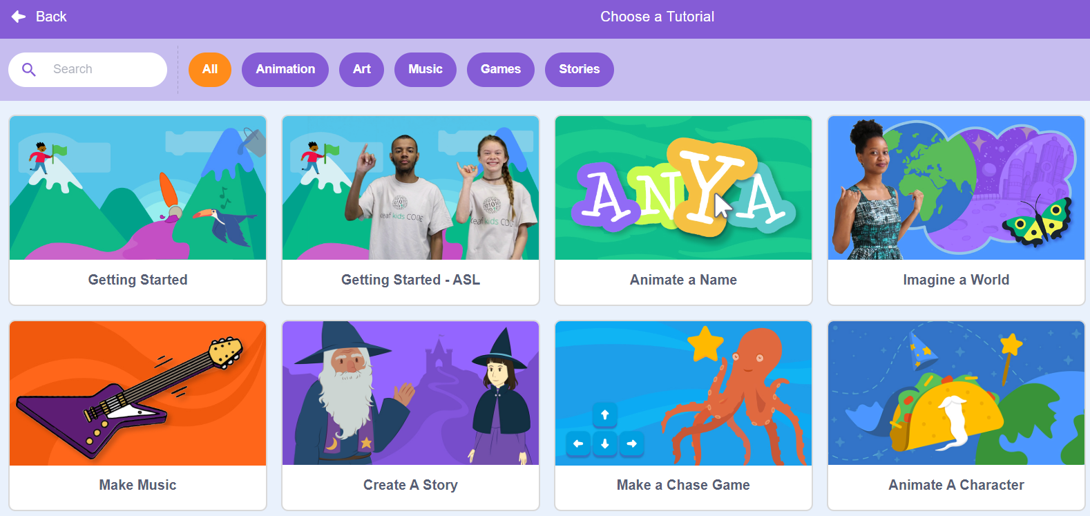 Scratch offers a variety of tutorials that guide users through creating new projects, animations, games, and more.